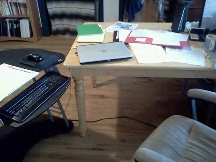 My desk consists of a table with a printer on one end, and a rolling computer cart for my laptop. For many years I worked in a much smaller space, and I love being able to spread out now! Here’s what it looks like when I’m deeply into a project.