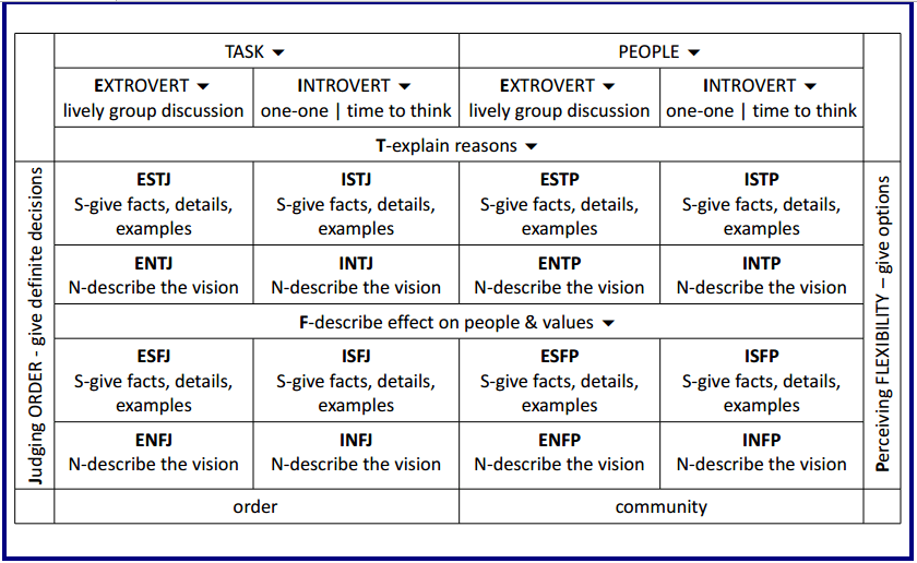 For example, as an INFJ I prefer one to one communication with time to think. I like organized information and definite decisions, imaginative language that describes the big picture and the effect on people and values. In each category there is a range with some stronger preferences along a spectrum, and there can be crossover among categories. I also enjoy lively group discussions, especially about ideas, and have an interest in details. It can always be helpful to ask.