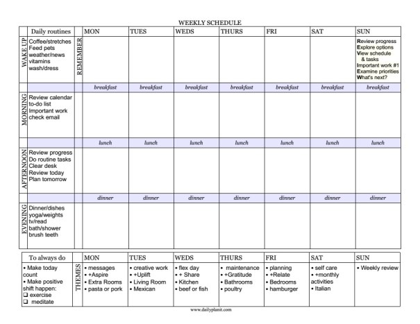 Download a blank Weekly Schedule (pdf): 1. Write daily routines in the first column. 2. Fill in regular weekly meetings, appointments, etc. 3. Add themes for each day of the week for: focus, +shift, cleaning & menus, or whatever works for you.