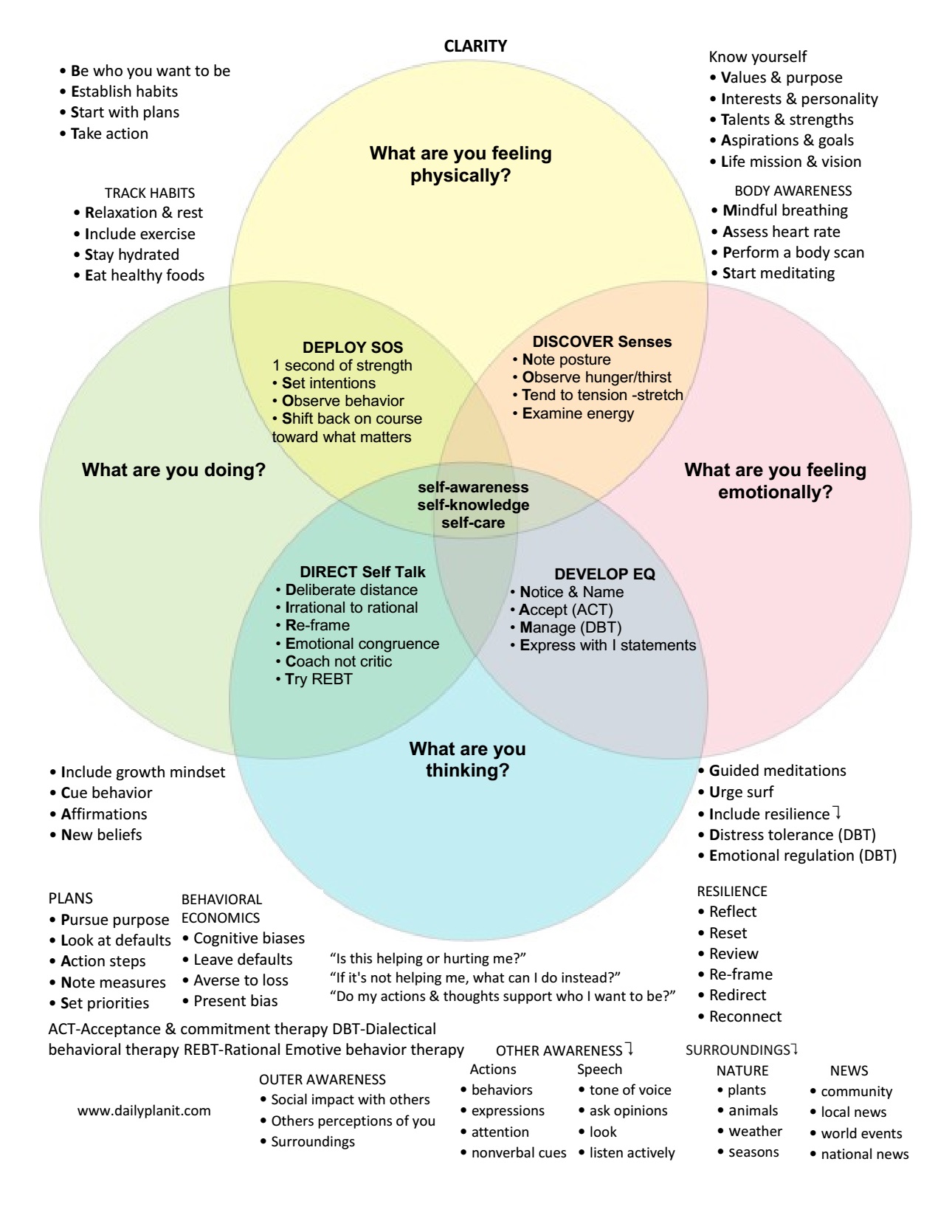SELF AWARENESS begins with knowing yourself well: your values and purpose, interests and personality, talents and strengths, aspirations and goals, life mission and vision. [start at Discover U in Ten Steps] In the present moment, notice what you are feeling physically and emotionally, what you are thinking, and what you are doing. Affiliate links to books at Amazon in the post below provide a small commission to help support the Daily PlanIt.