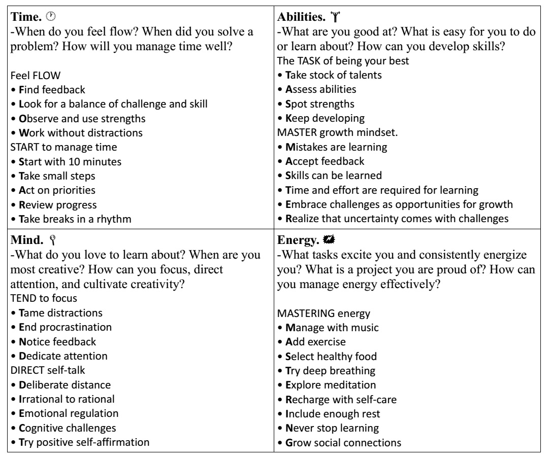 - Energy. What tasks excite you and consistently energize you? What is a project you are proud of? How can you manage energy effectively?